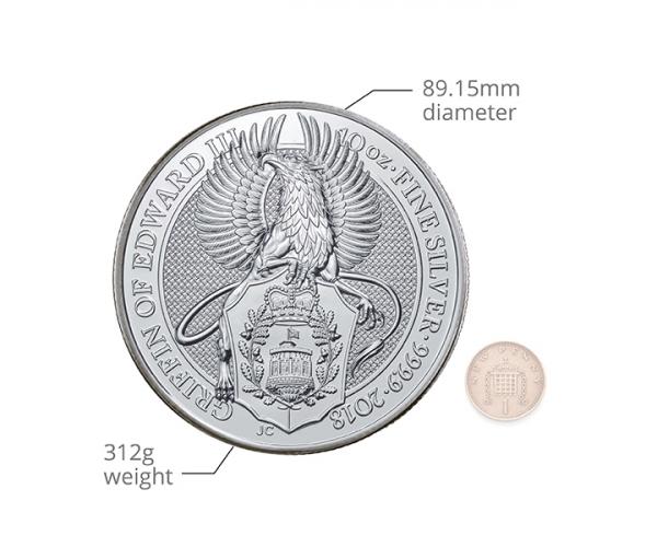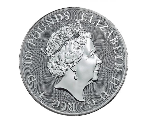 A 10 Ounce silver queens beast coin produced and manufactured by the Royal Mint. This coin weighs exactly 311 Grams and is minted in pure Silver.