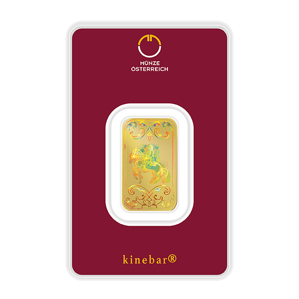 the Kinebars are gold bars produced by the Austrian Mint with an engraved security element, the KINEGRAM, a special effect developed and patented by Landis & Gyr. The world-famous white Lipizzaner horse of the Spanish Riding School in Vienna features on the design of the Austrian Mint’s Kinebars. As their position changes according to the angle at which the design is viewed, horse and rider appear to jump. This is why they are favoured as gifts and can even be worked into jewellery. The Austrian Mint Kinebar is available in 1 gramme, 5 gramme and 10 gramme bars.