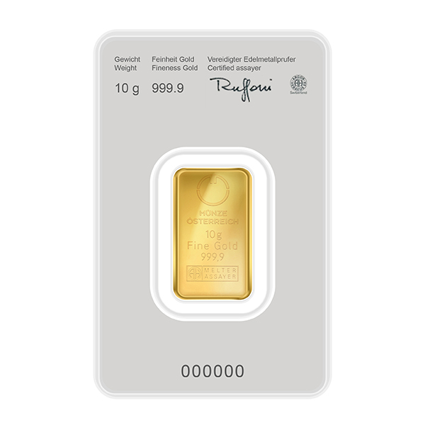 A 10 gram Kinebar produced and manufactured by the Austrian Mint. This bar is minted in pure gold 999.9 and comes complete in a tamper proof sealed packaging and an embeded certificate on the rear.