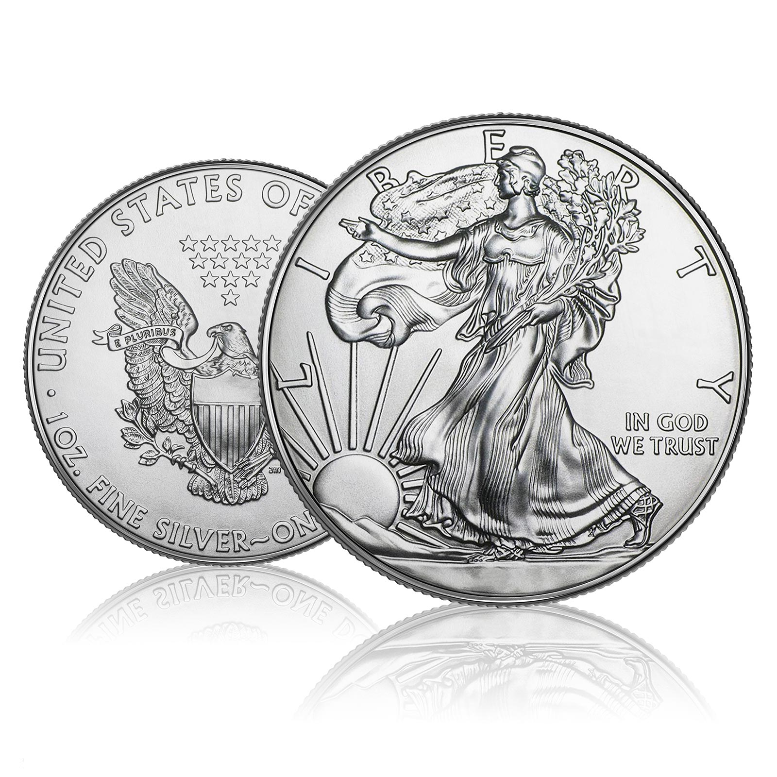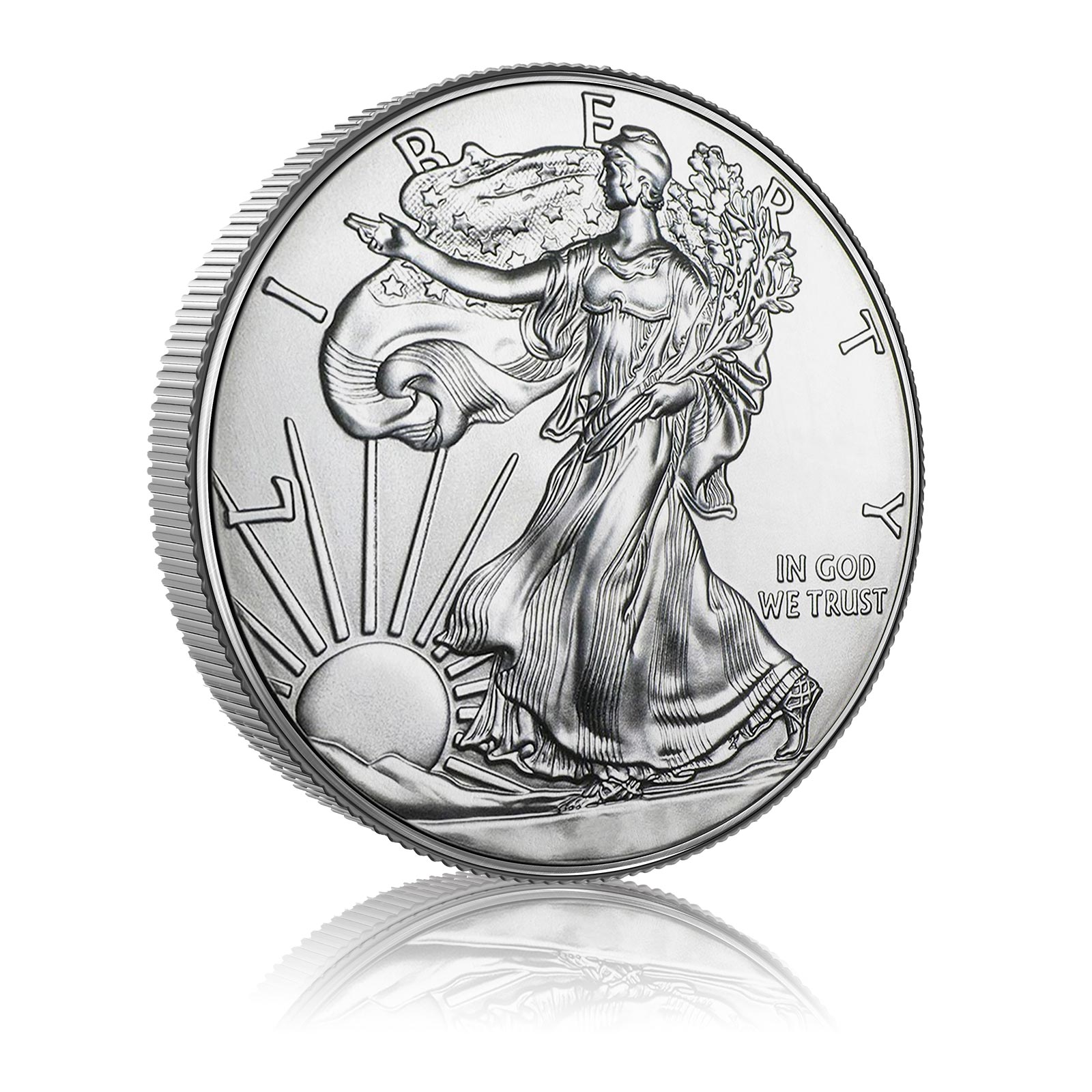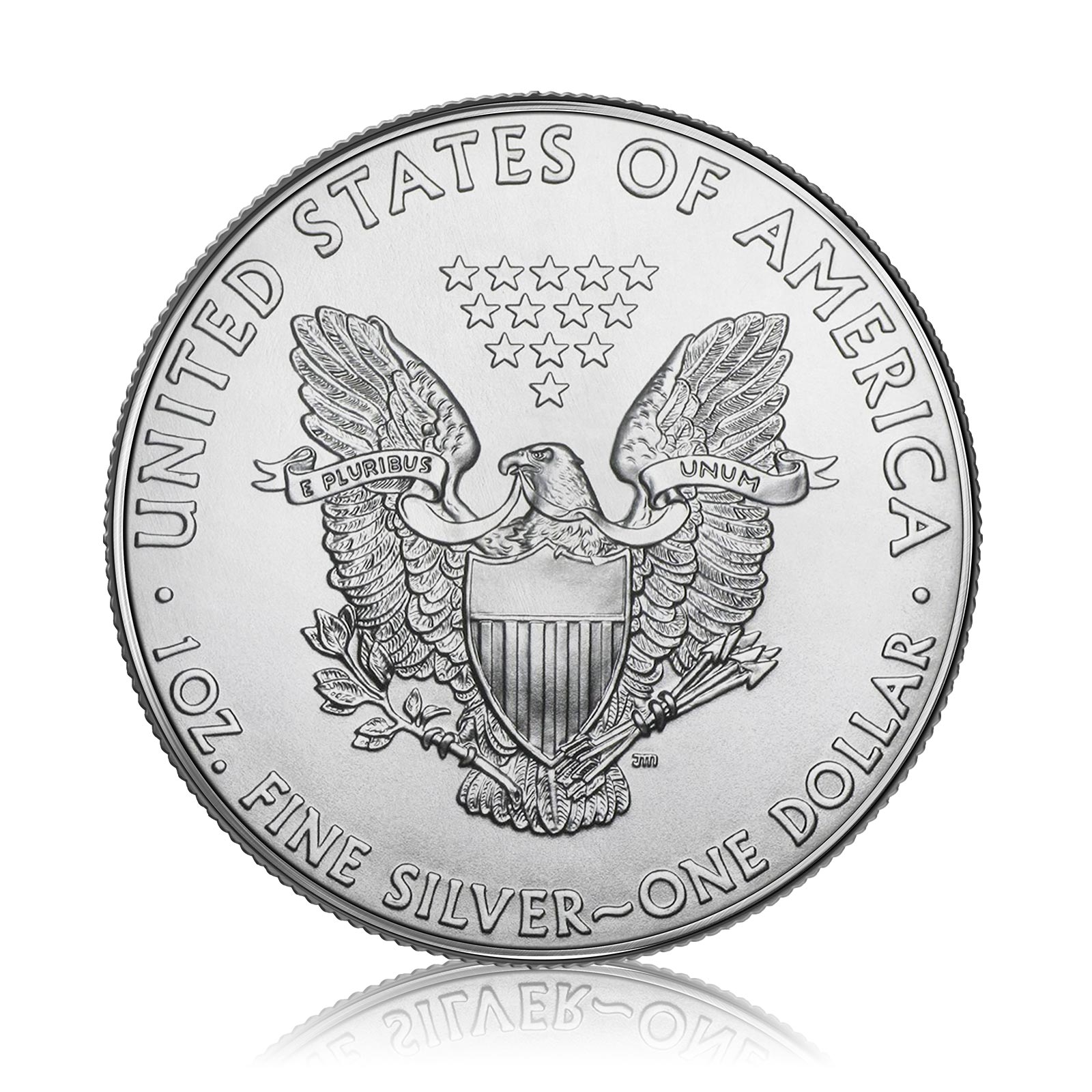 The One Ounce Silver Eagle is the official Bullion coin of the United States and has a face value of $1. On the front of the coin is the Lady Liberty design by Adolph Alexander Weinman, an American sculptor. Here the lady is wearing an American flag while the sun rises behind her, with the word LIBERTY emblazoned along the top of the coin. Behind her leg is the phrase ‘In God We Trust’ It features 13 stars, which represent the original colonies of America, and features the traditional Latin ‘E Pluribus Unum’ which means ‘Out of Many, One’.